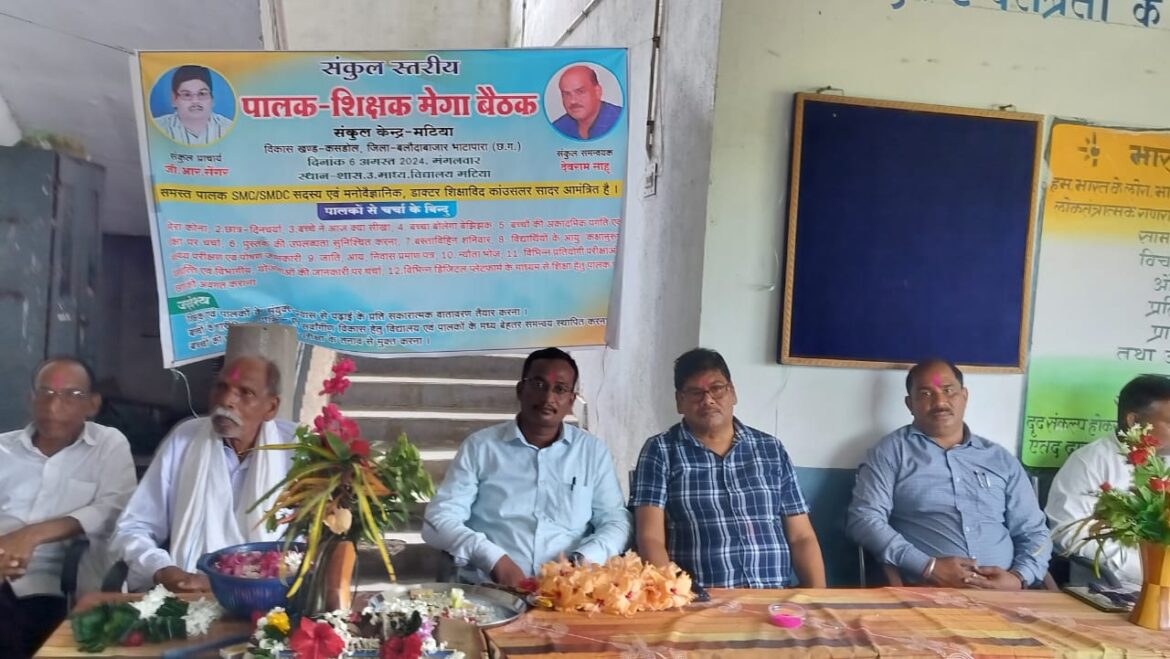 सुकली। बलौदा बाजार भाटापारा जिला के कसडोल ब्लाक अंतर्गत शासकीय उच्चतर माध्यमिक विद्यालय मटिया में मेगा पीटीएम पालक-शिक्षक मेगा बैठक का आयोजन किया गया, जिसमें ग्राम पंचायत सुकली के सरपंच सहित गणमान्य लोग शामिल हुए। बताया गया कि शिक्षक एवं पालकों के संयुक्त प्रयास से पढ़ाई के प्रति सकारात्मक वातावरण तैयार करने के अलावा बच्चों के शारीरिक, मानसिक एवं सर्वांगीण विकास के लिए विद्यालय एवं पालकों के मध्य बेहतर समन्वय स्थापित करना साथ ही बच्चों की काउंसलिंग कर उन्हें परीक्षा के तनाव से मुक्त करने की मंशा से मेगा पीटीएम का आयोजन किया गया है।