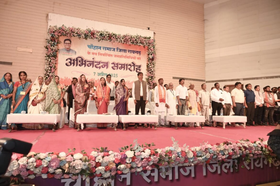 चौहान समाज के तत्वाधान में समाज के निर्वाचित जन प्रतिनिधियों का मुख्य अतिथि ओपी चौधरी के कर कमलों से प्रशस्ति पत्र के जरिए से अभिनंदन किया गया। समारोह में बतौर मुख्य अतिथि ओपी चौधरी के आगमन पर पुष्य वर्षा कर की गई उन्हें लड्डुओं से तौला गया उनके सम्मान में रंगोली बनाई गई। कार्यक्रम का शुभारंभ बाबा साहेब अंबेडकर एवं दुल्हा देव के तैल चित्र पर पूजा अर्चना के बाद किया गया। उसके बाद छत्तीसगढ़ी लोक गीत अरपा पैरी के धार का गायन किया गया। मंचस्थ अतिथियों का स्वागत के पश्चात मुख्य अतिथि के स्वागत में लिखा गया अभिनन्दन पत्र एवं स्वामी विवेकानंद का मोमेंटो सौंपा गया। महापौर जीवर्धन सहित समाज के निर्वाचित जन प्रतिनिधि सरपंच पंच पार्षद बी डी सी का सम्मान मुख्य अतिथि के कर कमलों से किया गया उसके बाद वरिष्ठ जनों का उद बोधन कार्यकम हुआ। मंच का कुशल संचालन एवं आभार प्रदर्शन कुलमणि चौहान एवं मनोहर चौहान ने किया ।