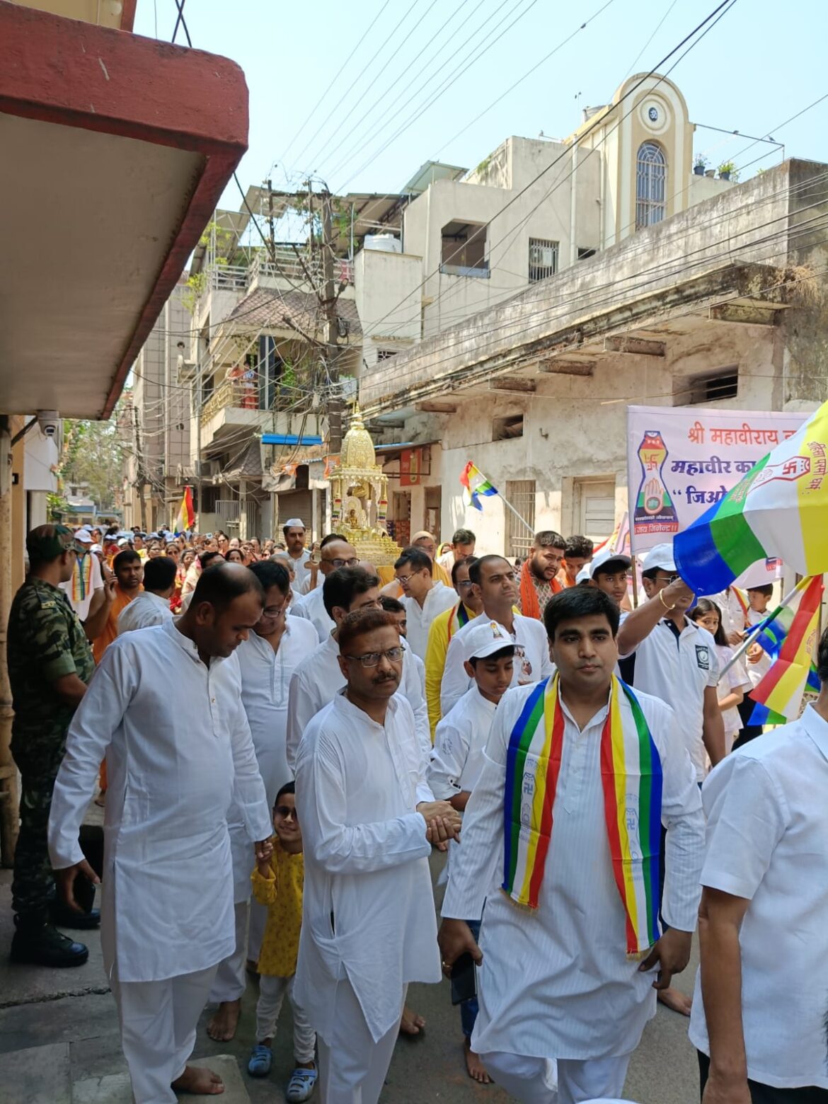 रायगढ़। विश्व को सत्य और अहिंसा का संदेश देने वाले जैन धर्म के चौबीसवें तीर्थंकर परम कृपालु भगवान महावीर स्वामी जी का जन्मकल्याण उत्सव रायगढ़ में पूरी श्रद्धा और भक्तिपूर्वक मनाया गया। एक दिन पूर्व 9 अप्रैल को विश्व नवकार दिवस पर प्रातः मंदिर में एकत्र होकर जैन धर्मावलंबियों ने एक घंटे तक अनवरत पवित्र नवकार महामंत्र का सामूहिक जाप करके वातावरण को शुद्ध किया तथा जीव दया के निमित्त गौशाला में गौ माता को चारा खिलाया गया। आज प्रातः प्रभु की स्नात्र पूजा की गयी। फिर सुबह 10 बजे भगवान महावीर स्वामी की शोभायात्रा निकाली गयी। स्टेशन रोड स्थित दिगम्बर जैन मंदिर से बाजे-गाजे के साथ प्रभु की भव्य पालकी आरम्भ होकर दरोगापारा स्थित श्वेतांबर जैन मंदिर पहुंची।