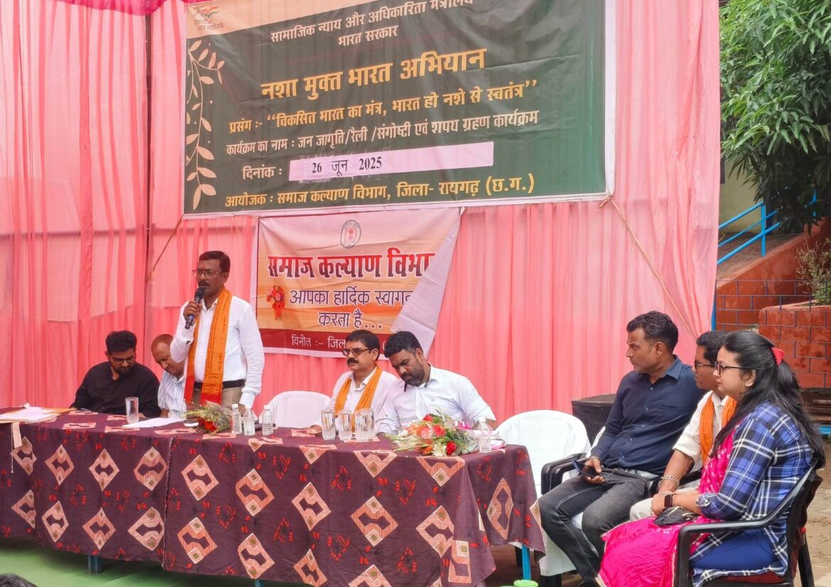 उन्होंने लोगों से नशा ना करने की अपील करते हुए नशामुक्त जनजागरूकता अभियान में स्वयं शामिल होकर कार्यक्रम को सफल बनाने हेतु कहा। सभापति श्री डिग्री लाल साहू ने कहा कि नशा समाज के लिए घातक है। नशा नाश का जड़ है। उप पुलिस अधीक्षक सुशातों बनर्जी ने कहा कि शराब अथवा अन्य मादक पदार्थ सेवन कर वाहन चलाना दुर्घटनाओं का प्रमुख कारण बन रहा है और नशे के चलते अपराधों में भी वृद्धि हुई है, जिसे रोकना अत्यन्त जरूरी है। इसलिए व्यक्ति स्वयं जागरूक रहें और नशा से दूर रहे। डॉ.विवेक उपाध्याय ने बताया कि नशे से किस प्रकार बीमारियां बढ़ रही है और लोग अपने शौक के कारण अपने आप को मौत के मुंह में ढकेल रहे हैं।समाज कल्याण विभाग के उप संचालक शिवशंकर पाण्डेय ने अंतर्राष्ट्रीय नशा निवारण दिवस के उपलक्ष्य में योजना पर आधारित जानकारी देते हुए यह बताया गया कि समाज कल्याण विभाग द्वारा जिला रायगढ़ में नशामुक्त भारत अभियान के तहत जनजागरूकता अभियान चलाते हुए जनमानस में नशा ना करने हेतु अपील की जा रही है।