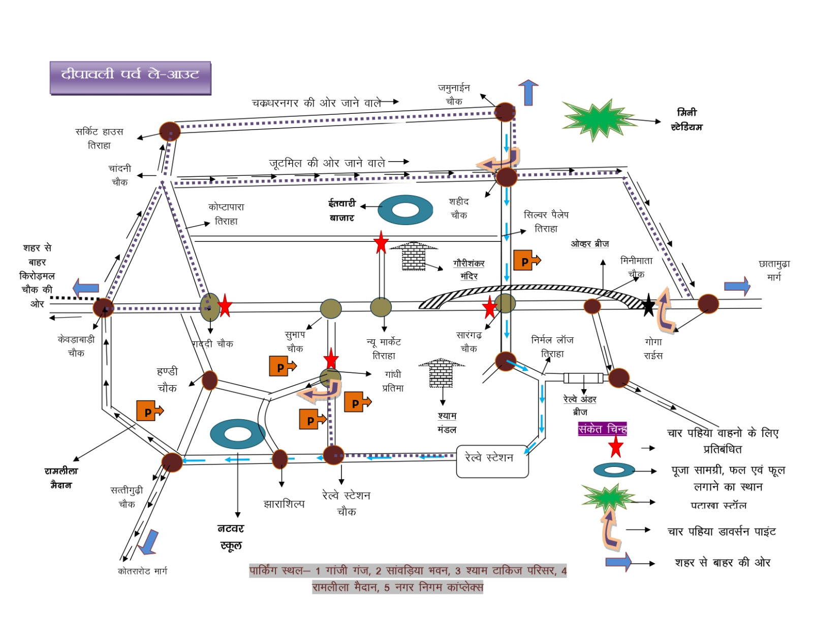 रायगढ़। दीपावली पर्व के दौरान शहर की ट्रैफिक व्यवस्था को दुरुस्त रखने यातायात पुलिस ने पार्किंग और एकांगी मार्ग के अलावा डायवर्सन पाइंट सहित चार पहिया वाहनों के लिए प्रतिबंधित मार्ग घोषित किया है। यातायात पुलिस द्वारा व्यापारियों , गणमान्य नागरिक एवं ग्राहकों से विनम्र अपील की गई है। दीपावली पर्व के दौरान जिला मुख्यालय में सुरक्षित एवं सुगम यातायात व्यवस्था बनाये रखने यातायात विभाग द्वारा दिये गये निर्देश के अनुरूप कार्यवाही कर सहयोग करने का आग्रह किया गया है।