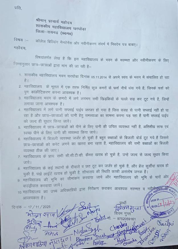 घरघोड़ा। शासकीय महाविद्यालय परिसर की बदहाल स्थिति और कॉलेज बिल्डिंग के मेंटेनेंस में गंभीर लापरवाही को लेकर सोमवार को NSUI घरघोड़ा इकाई ने जमकर रोष जताया। नगर अध्यक्ष शिवम् गुप्ता के नेतृत्व में NSUI की टीम व कॉलेज के छात्र-छात्राएँ प्राचार्य के नाम ज्ञापन सौंपने पहुँचे, जहाँ उन्होंने कॉलेज में व्याप्त अव्यवस्था, जर्जर भवन और कई वर्षों से लंबित रखरखाव कार्यों की ओर ध्यान आकर्षित कराया।