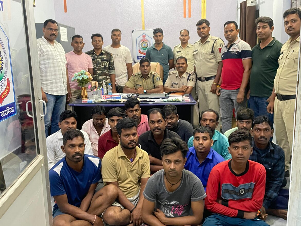 राम नारायण यादव पिता रमेश यादव 25 वर्ष मदनपुर गरोडी मोहल्ला चौकी खरसिया। सुनील विश्वकर्मा पिता सुरमत विश्वकर्मा 40 साल हमला पारा खरसिया।तनिश अग्रवाल पिता सुभाष अग्रवाल 26 साल मदनपुर बस्ती खरसिया। करन चौहान पिता जयराम चौहान 30 वर्ष मदनपुर बस्ती चौकी खरसिया। मुकुल विश्वकर्मा पिता राम किशन विश्वकर्मा19 साल मदनुपर बैरियर चौंक खरसिया। संतोष चौहान पिता छोटेलाल चौहान उम्र 40 साल निवासी मदनपुर गरोडी मोहल्ला चौकी खरसिया।अमर सिंह डनसेना पिता बरातु राम उम्र 32 साल निवासी बांसमुडा थाना खरसिया। उमेश चौहान पिता धनराम चौहान उम्र 27 साल निवासी मदनपुर चौकी खरसिया। पवन गुप्ता पिता सीताराम गुप्ता उम्र 39 साल निवासी छोटे देवगांव थाना खरसिया। सूरज गुप्ता पिता दिलीप गुप्ता उम्र 29 साल निवासी छोटे देवगांव थाना खरसिया।तरुण गुप्ता पिता हरिश्चंद्र गुप्ता उम्र 25 साल निवासी छोटे देवगांव थाना खरसिया।जयप्रकाश महंत पिता रामेश्वर दास महंत उम्र 33 साल निवासी राजघट्टा थाना खरसिया।आशीष खड़िया पिता गोपाल खड़िया उम्र 19 साल निवासी राजघट्टा थाना खरसिया।संतोष निषाद पिता रूप नारायण निषाद उम्र 33 साल निवासी मदनपुर बस्ती चौकी खरसिया।