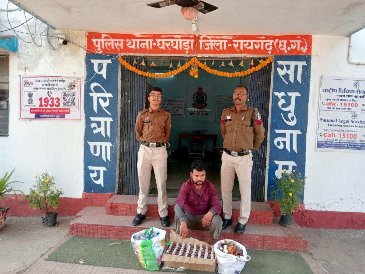 घरघोडा । रायगढ़ एसपी दिव्यांग पटेल के दिशा निर्देशन पर कल 19 नवंबर 2025 को घरघोड़ा पुलिस ने थाना प्रभारी निरीक्षक कुमार गौरव साहू के नेतृत्व में अवैध शराब कारोबार पर बड़ी कार्रवाई करते हुए ग्राम रायकेरा में दबिश देकर भारी मात्रा में अंग्रेजी और देशी शराब बरामद की। पुलिस को मुखबिर से सूचना मिली थी कि रायकेरा निवासी रूपेश बेहरा अपने घर में अवैध रूप से अंग्रेजी व देशी शराब बिक्री के लिए संग्रहीत कर रखा है।