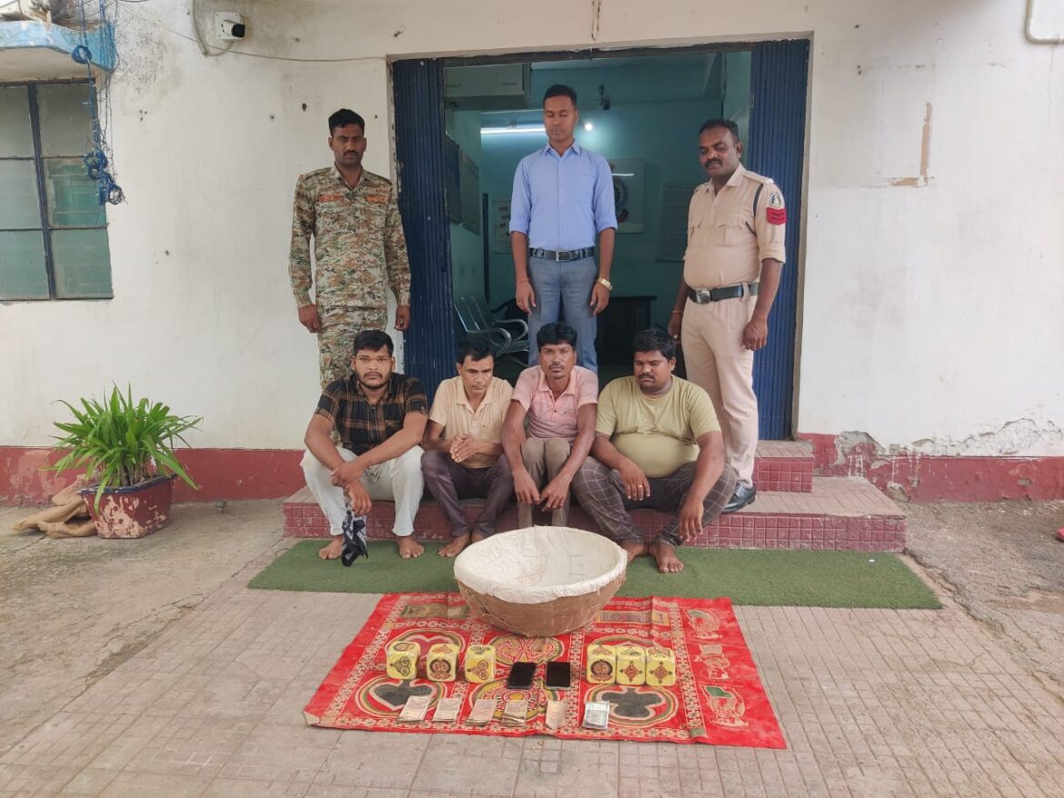रायगढ़। घरघोड़ा क्षेत्र अंतर्गत ग्राम भेंगारी में रथ मेला का आयोजन किया गया था । पुलिस पेट्रोलिंग को मुखबीर से रथ मेले में कुछ व्यक्तियों द्वारा खुडखुडिया पट्टी पर जुआ खेलाने की सूचना दी गई । तत्काल घरघोड़ा पुलिस की टीम द्वारा मेले में जुआ खेलाने वालों की घेराबंदी किया गया, मौके पर जुआ खेलने वाले भागे, पुलिस ने खुडखुडिया पट्टी पर जुआ खेलाने वाले 04 व्यक्तियों को पकड़ा जिनसे खुडखुडिया जुआ सामाग्री- खुडखुडिया पट्टी, बांस के टोकरी, गोटी और जुआ रकम ₹1560 एवं 02 मोबाइल की जप्ती की गई है । गिरफ्तार आरोपी- खगेश्वर पटैल पिता छबीलाल पटैल उम्र 32 वर्ष । सरोज यादव पिता मसत राम यादव उम्र 35 वर्ष। चैतन पटैल पिता कुमार पटैल उम्र 24 वर्ष सभी ग्राम भेंगारी, थाना घरघोडा। श्रवण विशाल पिता हेमलाल विशाल उम्र 36 वर्ष निवासी ग्राम डहोली थाना लुण्डा जिला सरगुजा हामु ग्राम भेंगारी, थाना घरघोडा जिला रायगढ़ के विरूद्ध धारा 6 छत्तीसगढ़ जुआ (प्रतिषेध) अधिनियम 2022 के तहत कार्यवाही किया गया है ।