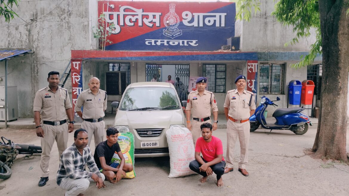 गांजा तस्करों और सप्लायर के खिलाफ एनडीपीएस एक्ट के तहत मामला दर्ज कर गिरफ्तार 3 आरोपियों को रिमांड पर भेजा गया है। पुलिस के मुताबिक घटना 23 मई की दोपहर की है जब तमनार थाना प्रभारी निरीक्षक आर्शीवाद राहटगांकर को मुखबिर से सूचना मिली कि ग्राम धौराभांठा की ओर से सेंट्रो कार में कुछ लोग गांजा भरकर ला रहे हैं। सूचना मिलते ही डीएसपी साइबर सेल अनिल विश्वकर्मा के मार्गदर्शन में पुलिस टीम ने सलिहाभांठा चौक पर घेराबंदी की और मुखबिर द्वारा बताई गई कार को रोकने का प्रयास किया। कार सवार तीनों व्यक्ति भागने की कोशिश करने लगे लेकिन पुलिस ने उन्हें मौके पर ही पकड़ लिया।