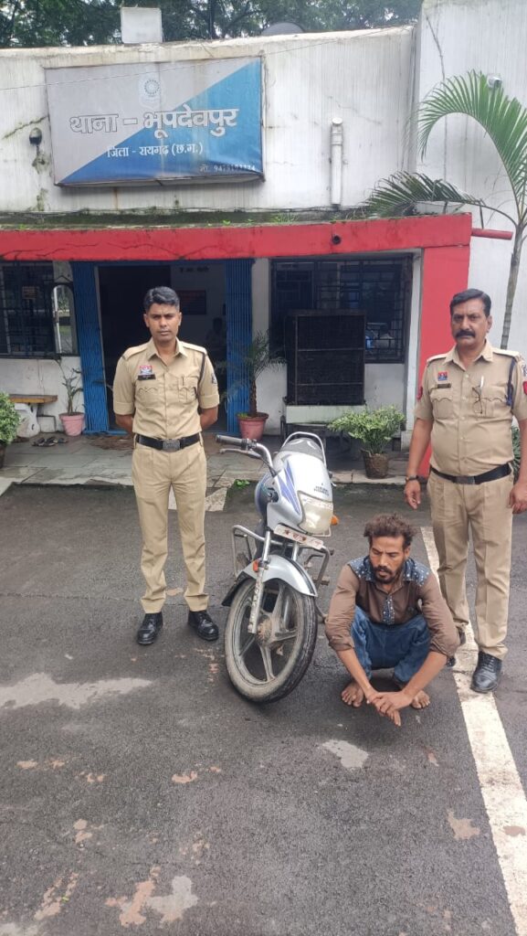 उसके आपराधिक रिकार्ड के आधार पर शक गहराया और सख्ती से पूछताछ करने पर उसने ग्राम जैमुड़ा से उक्त मोटरसाइकिल चोरी करना स्वीकार कर लिया। आरोपी पुरन लाल चौहान पिता स्व. हुलस राम चौहान उम्र 29 वर्ष साकिन लेबड़ा थाना भूपदेवपुर जिला रायगढ़ को गिरफ्तार कर चोरी की मोटरसाइकिल जप्त की गई। आरोपी को वाहन चोरी के अपराध में न्यायिक रिमांड पर जेल भेज दिया गया है।इस कार्रवाई में थाना प्रभारी भूपदेवपुर उप निरीक्षक संजय नाग, प्रधान आरक्षक प्रदीप गहलोत, संजय भूषण तिर्की, आरक्षक प्रदीप तिवारी, कोमल तिवारी और बोधराम सिदार की महत्वपूर्ण भूमिका रही।