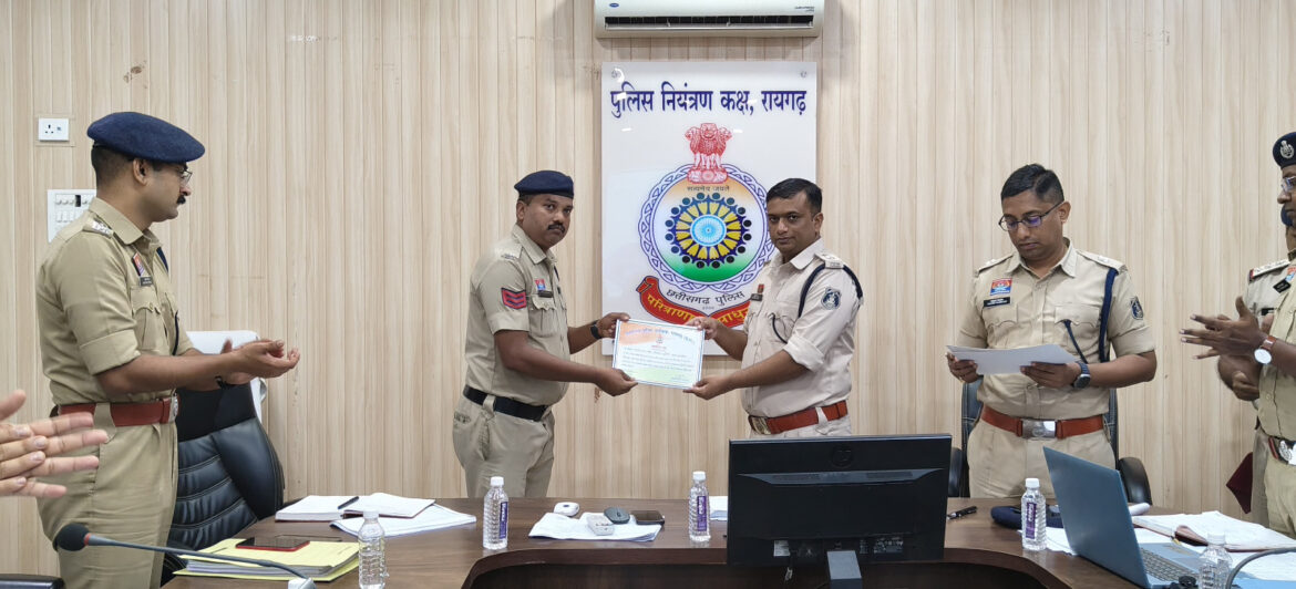 थाना कोतवाली के आरक्षक लोमेश सिंह राजपूत और प्रदीप मिंज को ओडिशा (झारसुगुड़ा) से मारपीट के आरोपी की गिरफ्तारी, जूटमिल थाना के प्रधान आरक्षक वीरेंद्र भगत, आरक्षक परमानंद पटेल और महिला आरक्षक आशा सिदार को 17 वर्षीय बालिका को जबलपुर (मध्यप्रदेश) से दस्तयाब करने, प्रधान आरक्षक मोहम्मद दिलदार कुरेशी और आरक्षक लखेश्वर पुरसेठ को हीरो होंडा शोरूम से नगदी की शत-प्रतिशत बरामदगी, तमनार थाना के प्रधान आरक्षक बनारसी लाल सिदार और हेमंत पात्रे को उड़ीसा से गुम महिला की दस्तयाबी, घरघोड़ा थाना क्षेत्र में हत्या के मामले में 3 घंटे में आरोपी की गिरफ्तारी में सराहनीय भूमिका निभाने वाले प्रधान आरक्षक पारसमणी बेहरा और आरक्षक हरीश पटेल, तथा कापू थाना क्षेत्र की गुम बालिका को झारखंड से बरामद कर लाने में उल्लेखनीय योगदान देने वाले प्रधान आरक्षक मनोज सिंह, आरक्षक संजीव पटेल एवं विक्रांत भगत को प्रशस्ति पत्र प्रदान कर उनका उत्साहवर्धन किया गया।