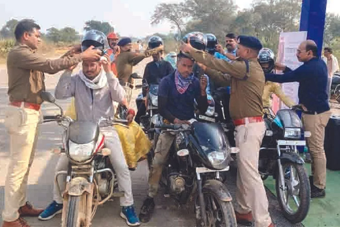 बिना हेलमेट बाइक चालकों पर हुई कार्रवाई, दुपहिया वाहन चालकों को बांटे हेलमेट