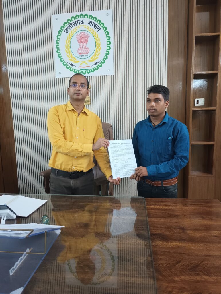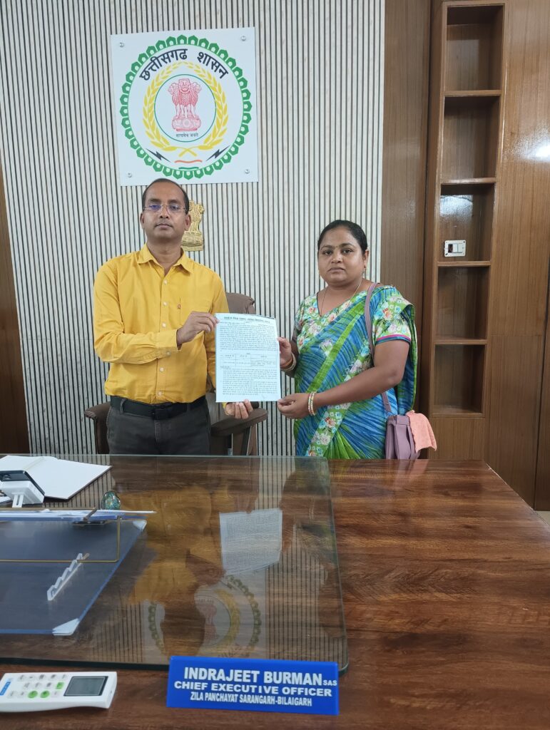 सारंगढ़= जिला पंचायत सीईओ इंद्रजीत बर्मन ने आज ग्राम माना कोनी पोस्ट गिरौदपूरी विकासखंड कसडोल जिला बलौदा बाजार निवासी श्रीमती संगीता पटेल पति स्वर्गीय रमेश कुमार पटेल को अनुकम्पा नियुक्ति आदेश पत्र सौंपा। इसी प्रकार ग्राम दशरमा पोस्ट रिस तहसील एवं जिला बलौदाबाजार निवासी संदीप कुमार पैंकरा को भी अनुकम्पा नियुक्ति आदेश पत्र सौंपा। जिला पंचायत सारंगढ़ बिलाईगढ़ के सीईओ इंद्रजीत बर्मन ने श्रीमती संगीता पटेल के पति स्व रमेश कुमार पटेल और संदीप कुमार पैंकरा के पिता स्व जयराम पैंकरा के आकस्मिक निधन उपरांत तत्परता पूर्वक कार्यवाही करते हुए दोनों को सहायक शिक्षक पंचायत के पद पर नियुक्ति प्रदान की गई है। श्रीमती संगीता पटेल को शासकीय प्राथमिक विद्यालय करमंदी विकासखंड बिलाईगढ़ तथा संदीप कुमार पैंकरा को शासकीय प्राथमिक विद्यालय सूतीउरकुली विकासखंड बिलाईगढ़ में पदस्थापना दिया गया है। मुख्य कार्य पालन अधिकारी ने अनुकम्पा नियुक्ति आदेश पत्र देकर अच्छे कार्य करने के लिए शुभकामनाएं दी।इस अवसर पर उनके परिजन उपस्थित रहे।
