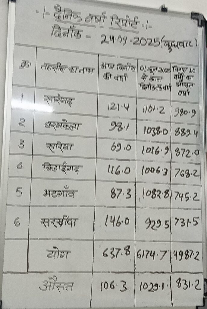 सारंगढ़ विगत रात्रि से हो रही भारी बारिश ने सारा रिकॉर्ड तोड दिए है तथा कल की बारिश का आज सुबह सात बजे किए गए माप के अनुसार सरसिंवा में सबसे अधिक 146एमएम दूसरे नंबर पर सारंगढ़ 121*4एमएम की बारिश,बिलाईगढ़ में116 ,बरमकेला में98.1,भटगांव में87.3,सरिया69 में एमएम की बारिश हुई है।जिससे जन जीवन अस्त व्यस्त हो गया है और सरसिवा में तो मुख्य मार्ग में कई घरों में भर गया था वही लात नाला में स्विफ्ट कार बहने से तीन लोग बड़ी मुश्किल से बचे है बहरहाल स्थिति का जायजा लेने कलेक्टर एसपी निकल गए हैं।