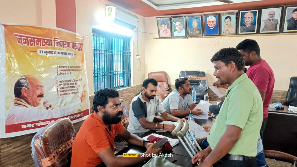 रायगढ़। छत्तीसगढ़ शासन नगरीय प्रशासन एवं विकास विभाग के निर्देशानुसार नगर पंचायत किरोड़ीमल नगर के वार्ड क्रमांक 1 से 15 में जन समस्या निवारण शिविर का आयोजन किया जा रहा है। जिसमें लोगों की पानी बिजली सफाई सड़क मरम्मत नाली मरम्मत, राशन कार्ड पेंशन सहित अन्य समस्याओं का आवेदन शिविर के माध्यम से लिया जा रहा है एवं प्राप्त आवेदनों का यथाशीघ्र निराकरण शिविर स्थल पर किया जा रहा है। नगर पंचायत किरोड़ीमल नगर को आज तक 132 आवेदन प्राप्त हुए हैं जिसमें से 40 आवेदनों का निराकरण शिविर स्थल पर ही कर दिया गया है।आवेदनों का निराकरण यथाशीघ्र किए जाने से नगर की आम जनता नगर पंचायत को साधुवाद दे रही है, नगर पंचायत द्वारा लोगों के समस्याओं का निराकरण यथा शीघ्र करने का प्रयास किया जा रहा है।।