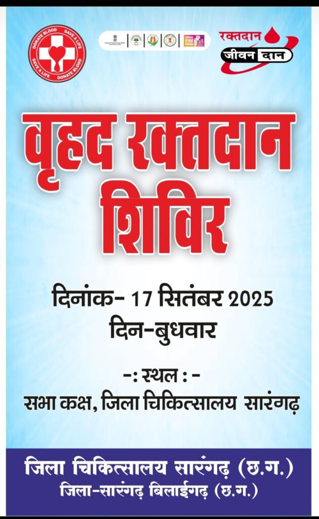 सारंगढ़ बिलाईगढ़, 16 सितंबर 2025/जिला अस्पताल सारंगढ़ में आज 17 सितंबर बुधवार को सुबह 10 बजे से वृहद रक्तदान, मेडिकल और दिव्यांग बोर्ड कैंप का आयोजन किया जा रहा है। इसमें इच्छुक नागरिक अपना इलाज और रक्तदाता रक्त दान कर सकते हैं