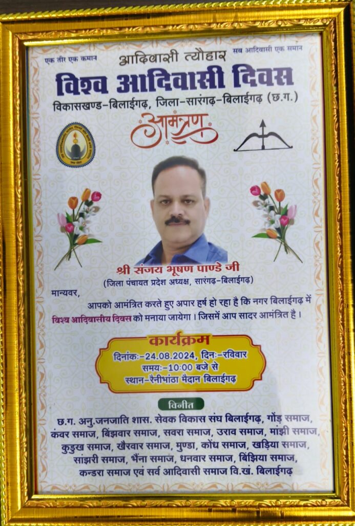 बिलाईगढ़ राज में आदिवासी गौरव का महोत्सव: 5,000 से अधिक लोगों ने मनाया विश्व आदिवासी दिवस ।बिलाईगढ़ राज द्वारा आयोजित विश्व आदिवासी दिवस समारोह का भव्य आयोजन आज बिलाईगढ़ में संपन्न हुआ। 5,000 से भी अधिक लोगों की उपस्थिति ने इस कार्यक्रम को ऐतिहासिक बनाया। मुख्य अतिथि संजय भूषण पांडेय , बिलाईगढ़ राज के राजा साहब ओंकारेश्वर शरण सिंह , दामोदर दुबे नगर पंचायत अध्यक्ष,जिला पंचायत सभापति युवराज शरण सिंह जी, भाजपा छत्तीसगढ़ के प्रदेश प्रवक्ता वेदराम जांगड़े, भाजपा आर्थिक प्रकोष्ठ के जिला संयोजक दुर्गेश केशरवानी , सुनील शर्मा , नीलेश दुबे , दिनेश चंद्रा , आदिवासी समाज के प्रमुख पदाधिकारी, गणमान्य नेता और कार्यकर्ता इस अवसर पर उपस्थित रहे। कार्यक्रम में आदिवासी संस्कृति, परंपराओं और उनके अमूल्य योगदान को भव्य रूप से सम्मानित किया गया। रंगारंग सांस्कृतिक प्रस्तुतियाँ और प्रेरक संबोधनों ने उपस्थित जनसमूह में एकता, गौरव और समरसता का संदेश प्रसारित किया। यह आयोजन आदिवासी समाज की समृद्ध विरासत को संरक्षित और प्रचारित करने की दिशा में एक महत्वपूर्ण कदम साबित हुआ।